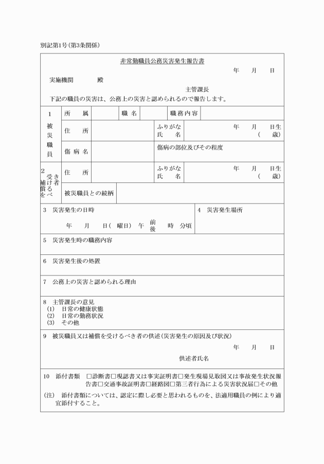第1条 この規則は、議会の議員その他非常勤の職員の公務災害補償等に関する条例(昭和42年条例第30号。以下「条例」という。)第2条の2第2項ただし書、第5条の2第2項第1号及び第2号、第8条ただし書第15条、第20条第2項、第22条の2第1項、第23条、附則第2条の4第1項から第3項まで及び附則第3条第1項から第3項までの規定に基づき、補償の手続きその他条例の実施に関し、必要な事項を定めるものとする。
