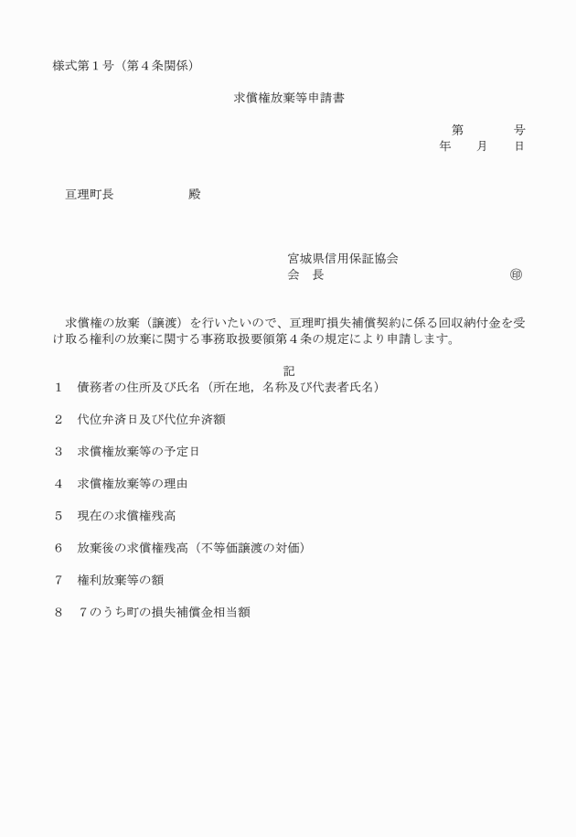 第4条 宮城県信用保証協会(以下「保証協会」という。)は、条例第3条の規定により求償権の放棄又は譲渡(以下「求償権の放棄等」という。)をしようとするときは、あらかじめ、求償権放棄等申請書(様式第1号)を町長に提出し、町長の承認を得なければならない。