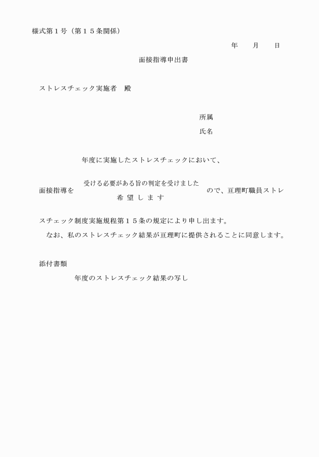 第15条 面接指導を希望する職員は、面接指導申出書(様式第1号)にストレスチェックの結果の写しを添付して、実施事務従事者を経由して実施者に申し出るものとする。