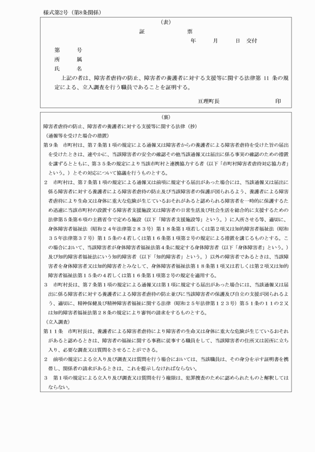 第8条 町長は、養護者による障害者虐待により障害者の生命又は身体に重大な危険が生じているおそれがあると認めるときは、障害者虐待防止法第11条の規定により職員に立入りを行わせ、必要な調査又は質問をさせるものとする。