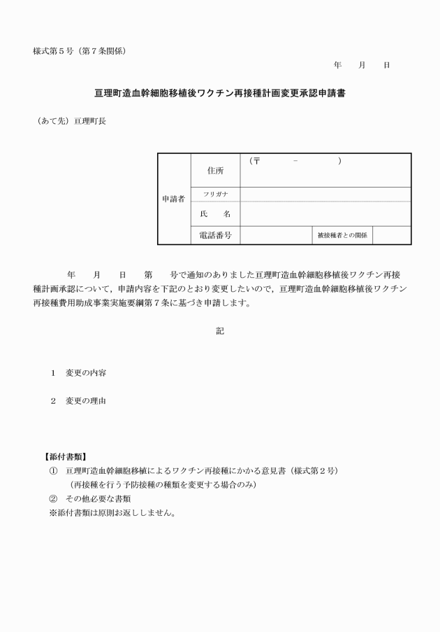 第5条 申請者は、亘理町造血幹細胞移植後ワクチン再接種計画承認申請書(様式第1号)に、次に掲げる書類を添えて、町長に申請しなければならない。