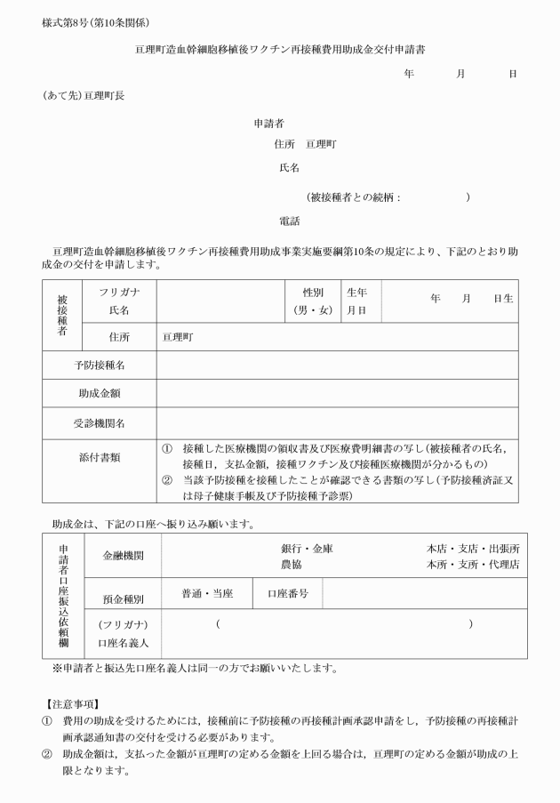 第10条 承認通知書を受けた申請者は、当該予防接種の接種日から1年以内に亘理町造血幹細胞移植後ワクチン再接種費用助成金交付申請書(様式第8号)に、次に掲げる書類を添えて、町長に提出しなければならない。