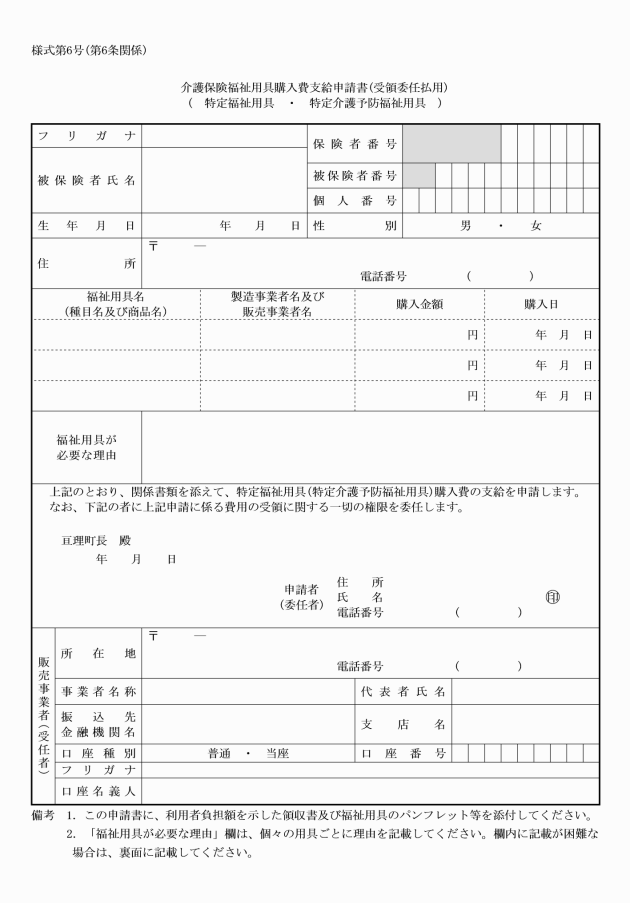 第6条 受領委任払により福祉用具購入費の支給を受けようとする要介護被保険者等は、当該支給に係る福祉用具を購入したときは、必要な書類を添えて、介護保険福祉用具購入費支給申請書(様式第6号)を町長に提出しなければならない。
