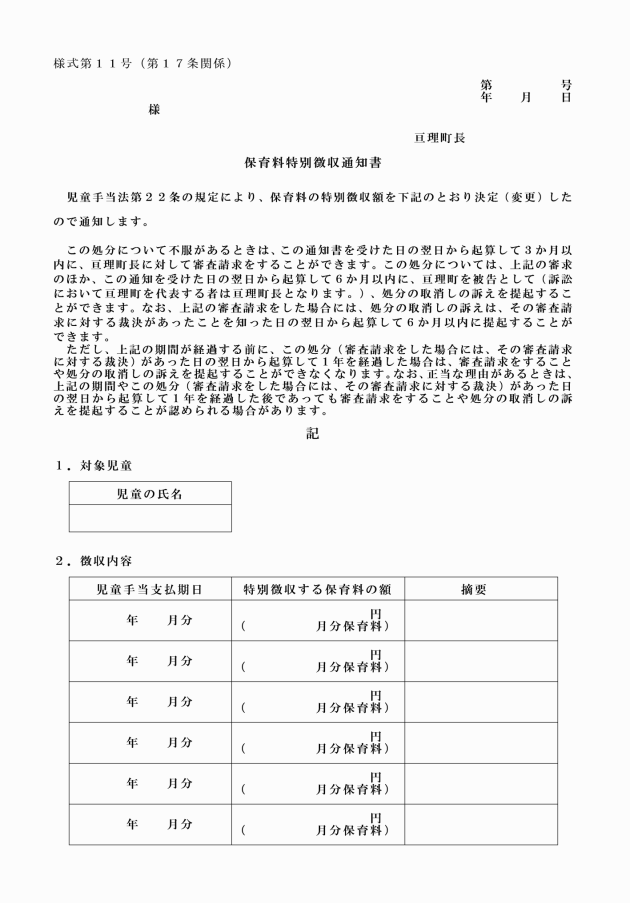 第17条 町長は、法第22条の規定に基づき児童手当から保育料を徴収(以下「特別徴収」という。)するときは、様式第11号による保育料特別徴収通知書を、特別徴収の対象者にあらかじめ送付するものとする。