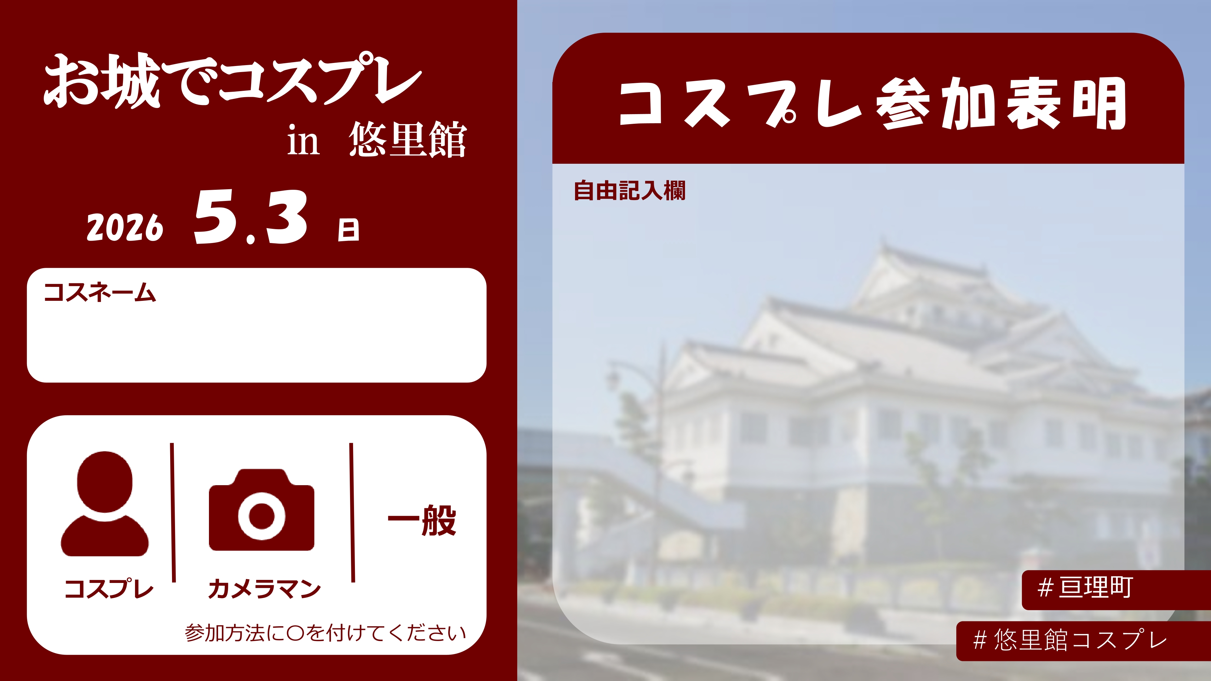 亘理町立郷土資料館HP 会場アクセス 規約について 「お城でコスプレin悠里館」へ参加される皆様は、下記の規約を必ずお読みください。 「お城でコスプレin悠里館」規約(PDF/1031KB) 参加表明について テンプレートをご利用ください。 参加表明テンプレート(JPG/1325KB) お問合せ先 亘理町立郷土資料館/文化財班電話番号:0223-34-8701FAX番号:0223-34-8709