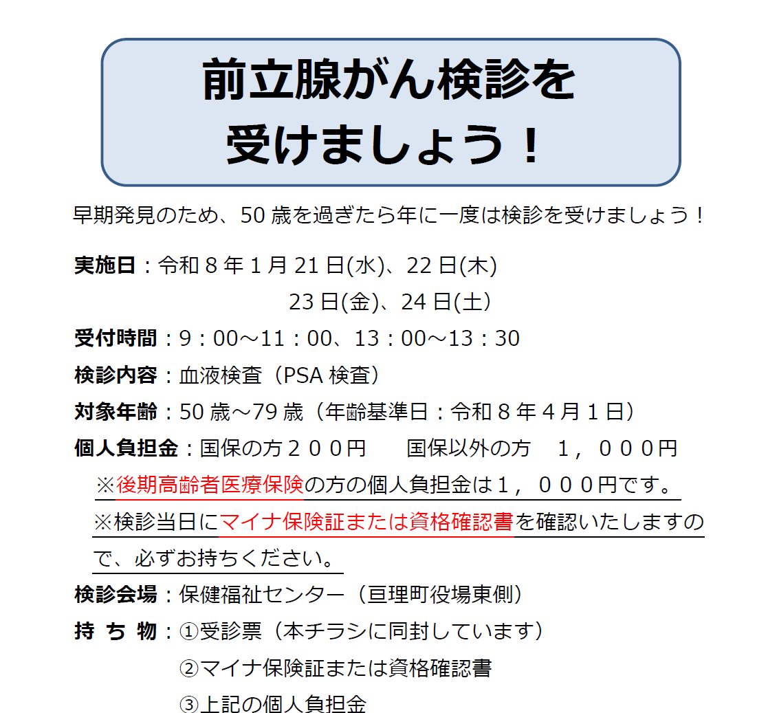 | 実施予定 | 医療機関検診:9月8日から11月29日 ※休診日を除く 検診車検診:令和8年1月21日から1月24日 |