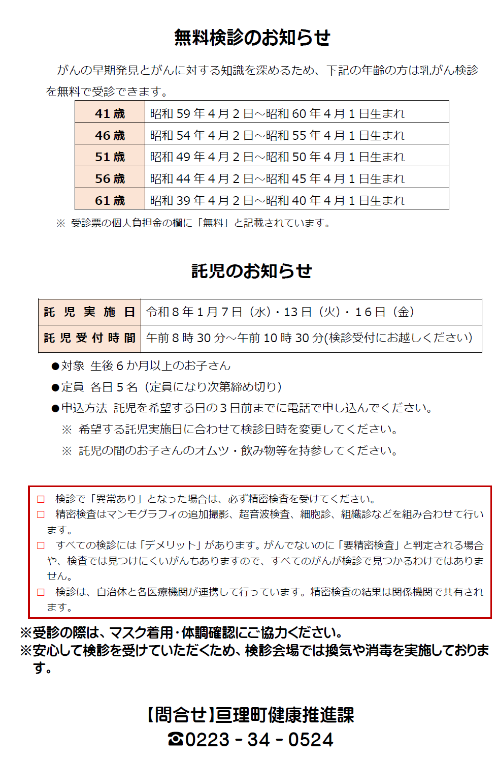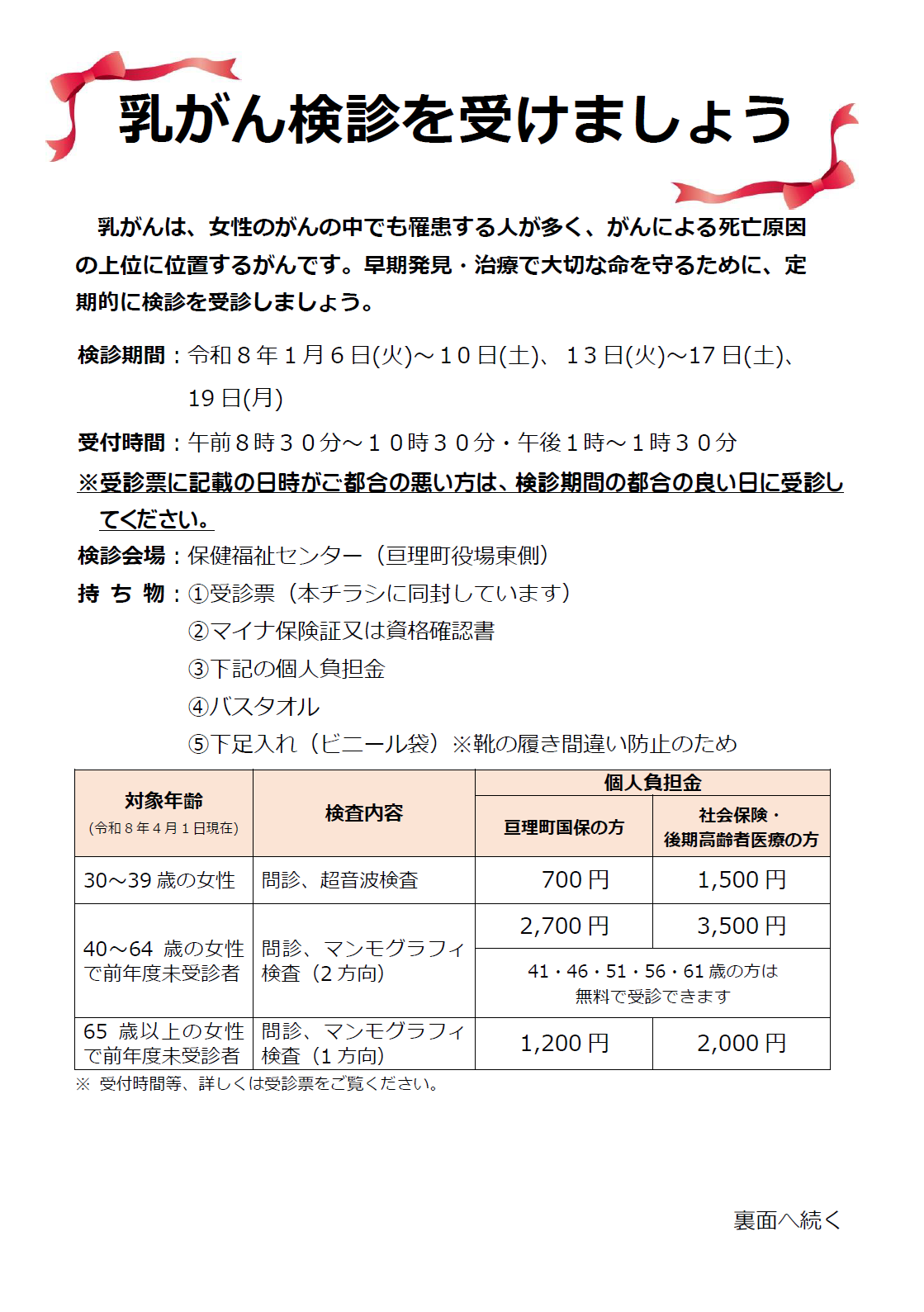 | 個人負担金 | 700円(亘理町国保の方は500円が助成されます。) |
